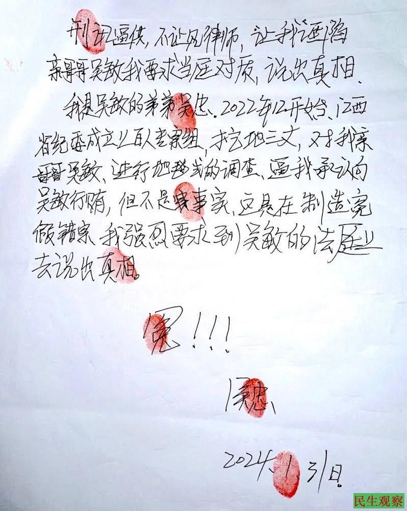 吴忠则是吴敏的亲弟弟,是江西吉安一名民营企业家。他在看守所的手书中称,自己从2022年12月开始,就被江西省纪委成立的专案组控制,每天都被逼问和哥哥的事,被诱骗写不见律师的声明,被打印好的笔录逼迫背诵,被录音录像,被威胁家人,被剥夺睡眠、洗澡、吃肉等基本权利,被坐烂屁股,被搞得面瘫。