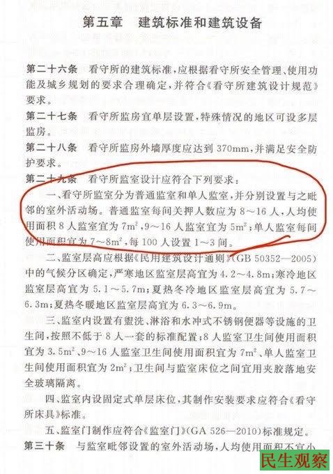 这个报复的行为实在是很令人气愤,因此我查询了中国国家的规定:这里是中华人民共和国住房和城乡建设部,中华人民共和国国家发展和改革委员会看守所建设标准,建标164-2013,这是2013年出台的标准,在第五章,建筑标准和建筑设备的第二十九条:看守所监室设计应符合下列要求,这里说得9-16人的监室宜为5平米,那么我算了一下,拿低的算,40个人乘以5等于200平米。