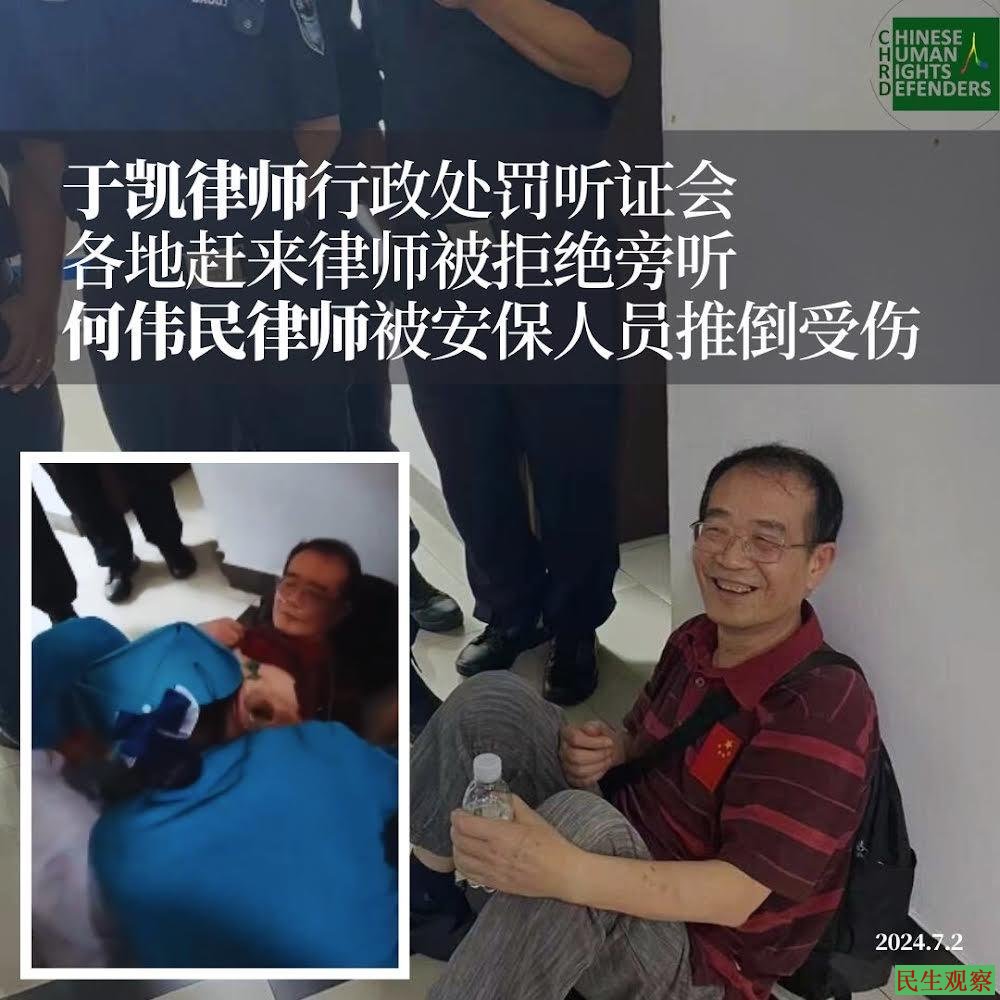 2024年7月2日,青岛于凯律师遭行政处罚听证会在青岛召开,各地赶来的律师被拒绝旁听,何伟民律师更是被安保人员推倒受伤。