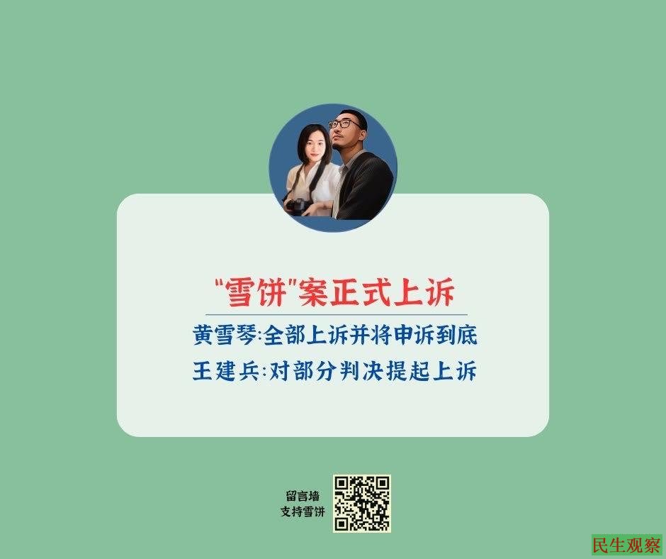 雪饼关注组日前经确认,雪饼两人已经正式向广东高院提起上诉。黄雪琴在宣判当天就表示要上诉,并已完成后续上诉流程,其表示无论未来二审结果如何,都将持续申诉到底;王建兵则对部分判决提起了上诉。