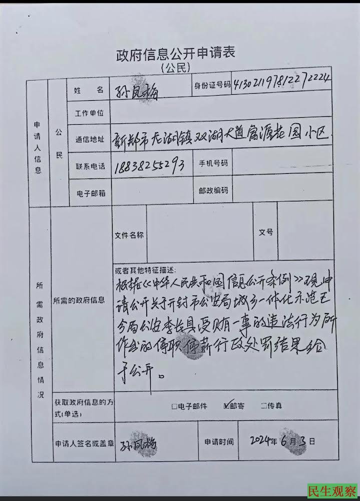 根据开封市公安局城乡一体化示范区分局出具的行政诉讼答辩状显示,2024年6月3日,孙凤梅向示范区分局邮寄《政府信息公开申请表》,申请公开:“关于开封市公安局城乡一体化示范区分局民警李长具受贿一事的违法行为所作出的停职停薪行政处罚结果给予公开”的信息。