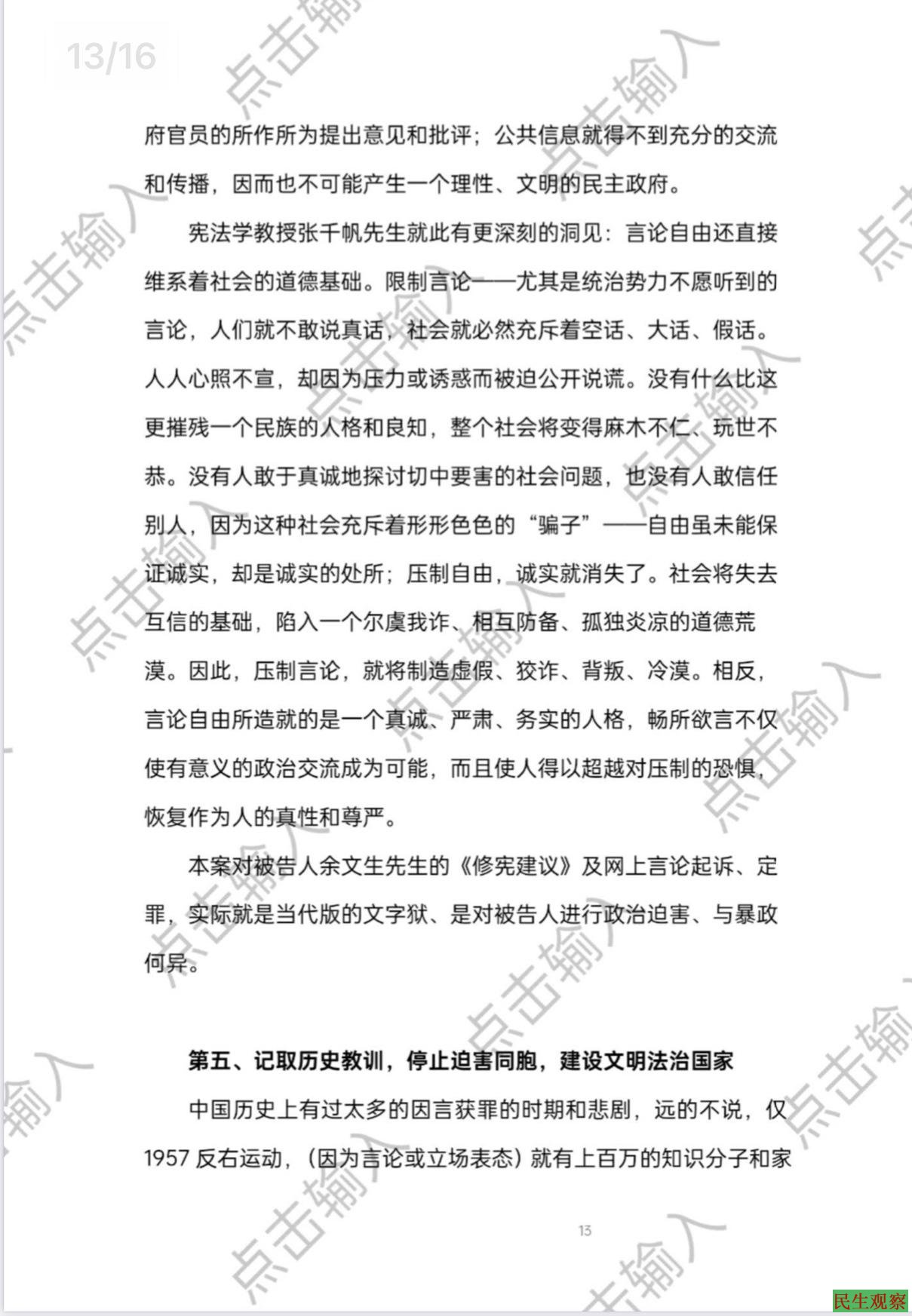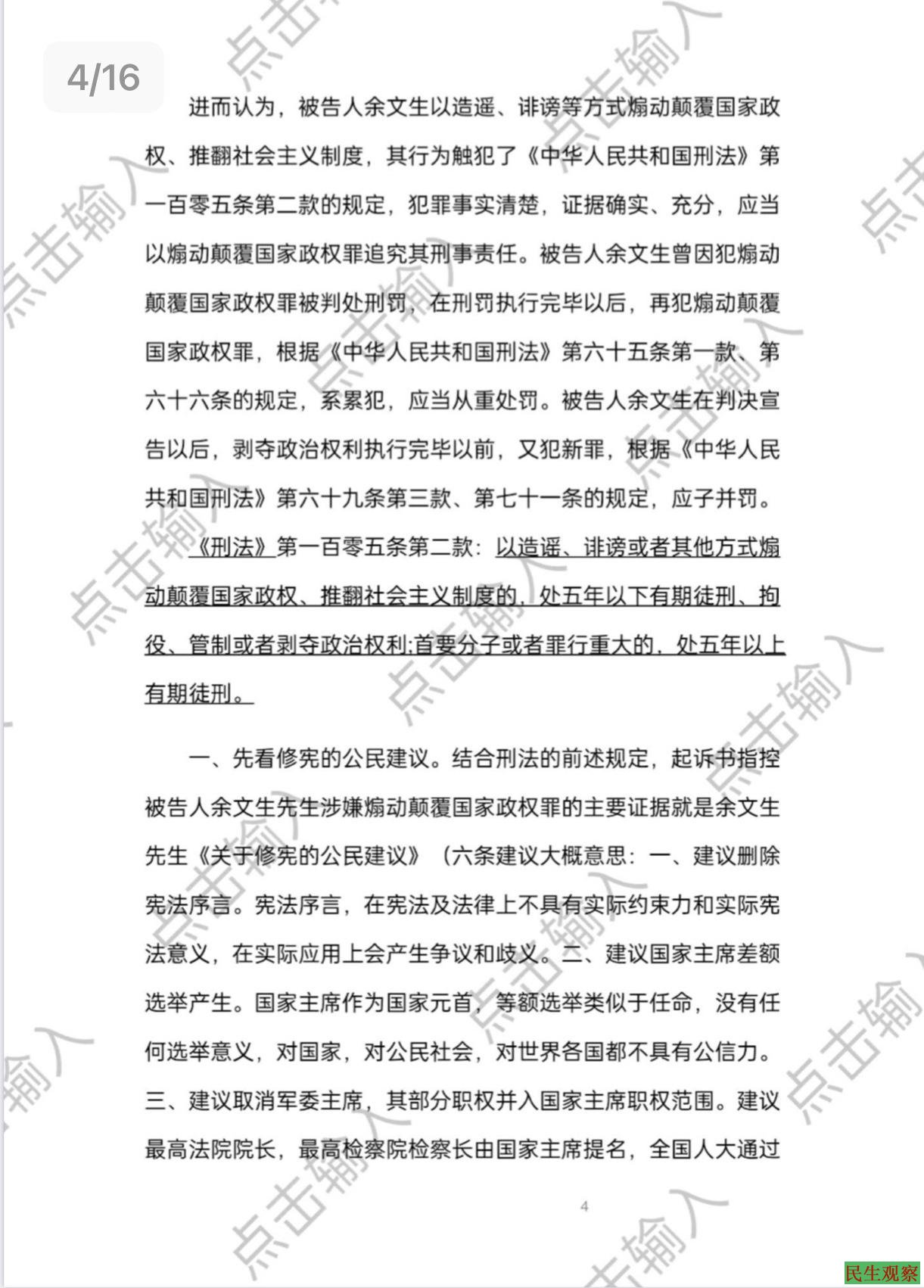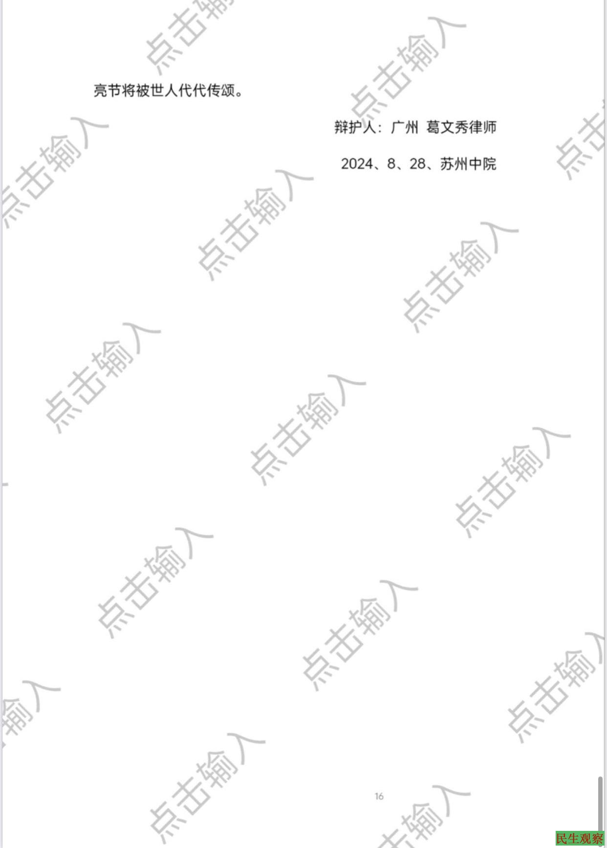 【民生观察2024年8月30日消息】广州律成定邦律师事务所,葛文秀律师认为:苏州市人民检察院,指控被告人余文生先生犯有煽动颠覆国家政权罪完全不能成立,余文生先生是完全无辜的,应依法宣告无罪。