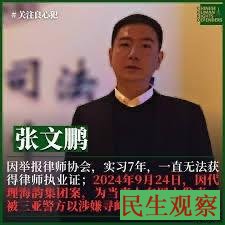 据悉,现年31岁的张文鹏,曾是山东晓临律师事务所一名实习律师。因举报青岛司法局的腐败,遭报复被永久禁止执业。