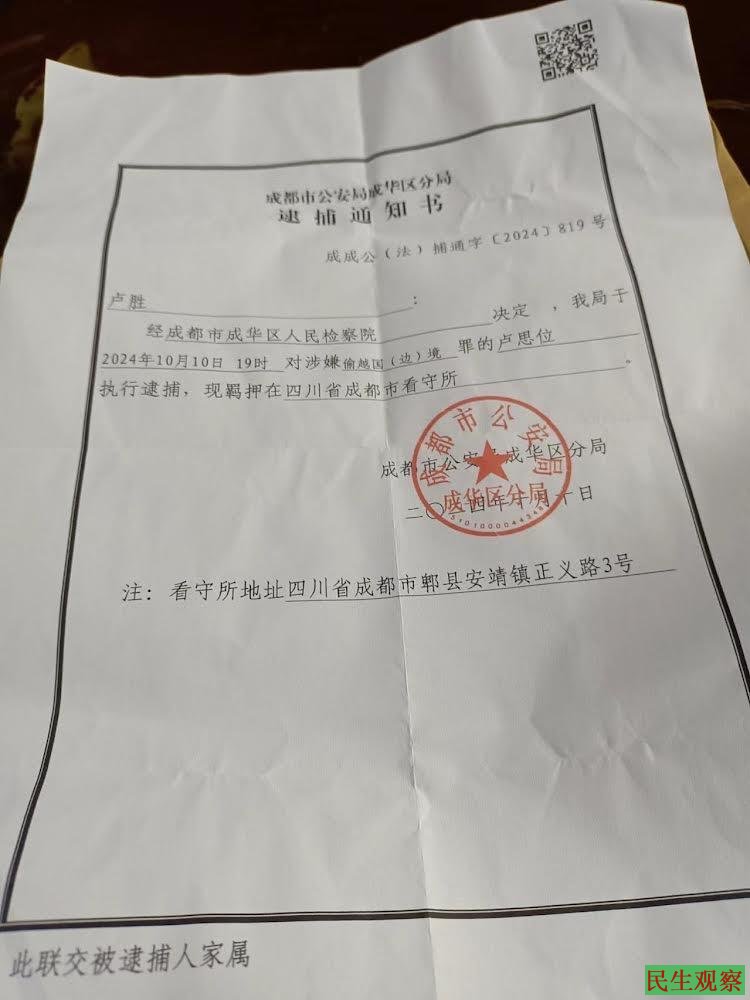 2024年10月10日19时,卢思位被成都市公安局成华分局正式逮捕,罪名是“偷越国境”,现羁押在成都市看守所。地址:成都市郫县安靖镇正义路3号。