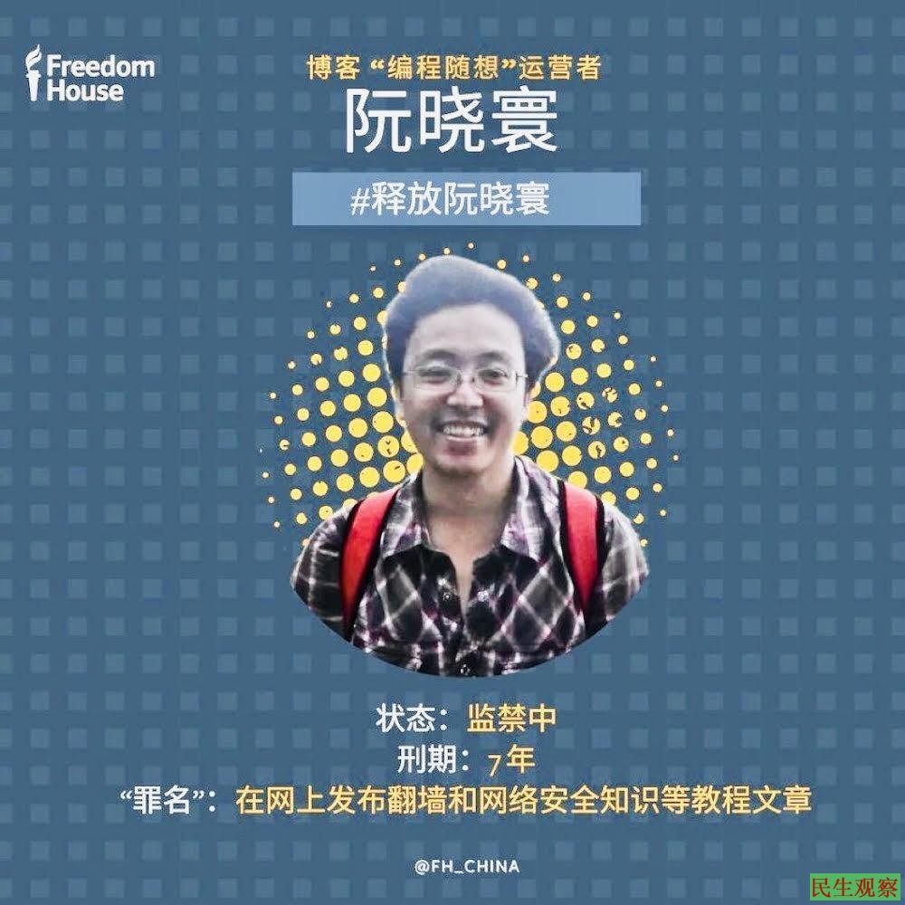 【民生观察2024年12月12日消息】阮晓寰(网名:编程随想),曾是2008年北京奥运会信息安全系统总工程师。其一审被上海中院二院以煽动颠覆国家政权罪判处有期徒刑7年;其二审将于2024年12月13日(周五)下午2:00在上海高级人民法院宣判。