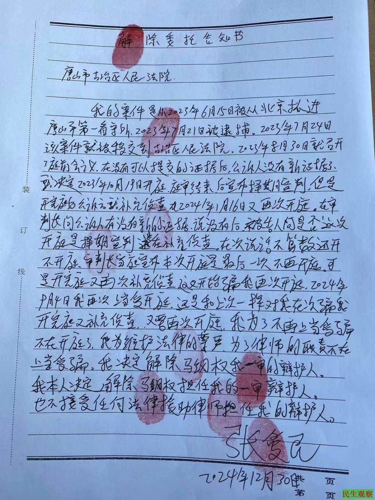 【民生观察2024年12月31日消息】唐山维权访民张爱民涉嫌寻衅滋事一案经过四次开庭任然不宣布判决,久押不判严重超期羁押,程序严重违法,法院原定明日2024年12月31日周二再次开庭,张爱民在律师会见后表态不再配合法院违法。解除了一审辩护律师马纲全。为尊重张爱民的本意律师不再代理开庭,接下来由法院即是运动员又是裁判员的自由表演