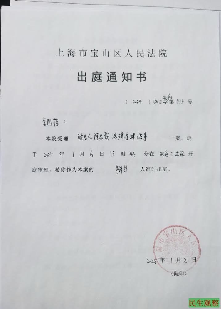 2025年1月2日,律师收到宝山法院法官电话,告知陈品霖涉嫌寻衅滋事罪一案,定于1月6日下午1:45分在刑庭第三法庭公开开庭审理。地址:上海市宝山区月罗公路2099号,电话:+86-2126078989转903021