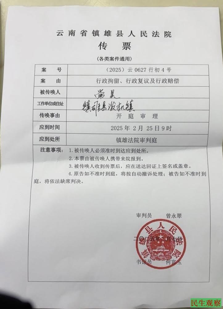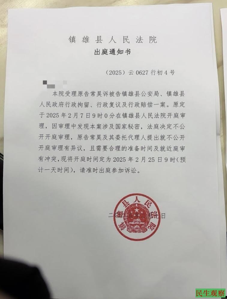 【民生观察2025年2月23日消息】本网获悉,镇雄和平归正教会常昊传道不服公安机关对他的行政处罚,对此提起行政诉讼,案件原本于2025年2月7日公开开庭,但法官说该案涉及国家秘密不公开开庭,律师和常昊传道对法院的公开开庭变为不公开开庭提出异议,最终开庭取消,变更为2025年2月25号上午九点钟开庭审理。