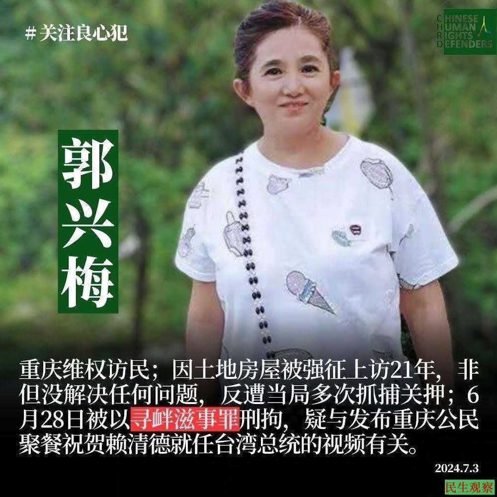 据悉,2024年6月28日,郭兴梅被以寻衅滋事罪刑拘,疑与发布重庆公民聚餐祝贺赖清德就任台湾总统的视频有关。