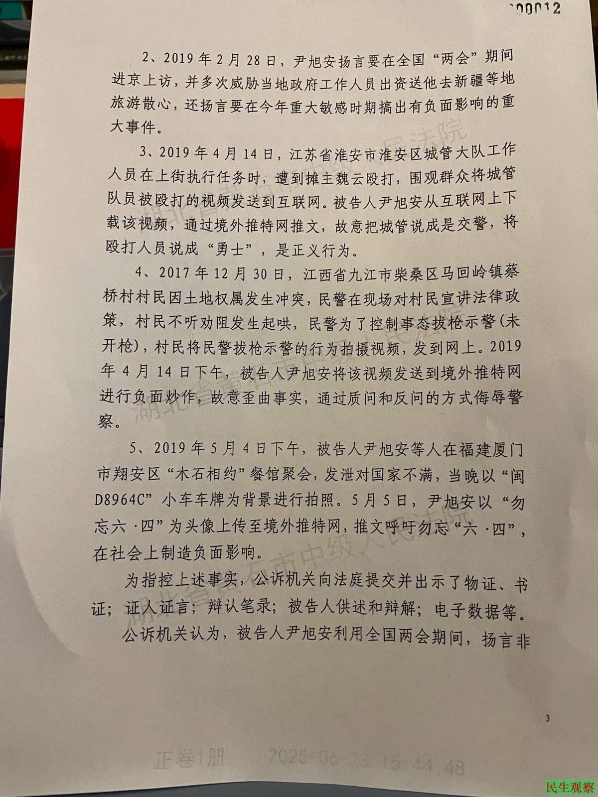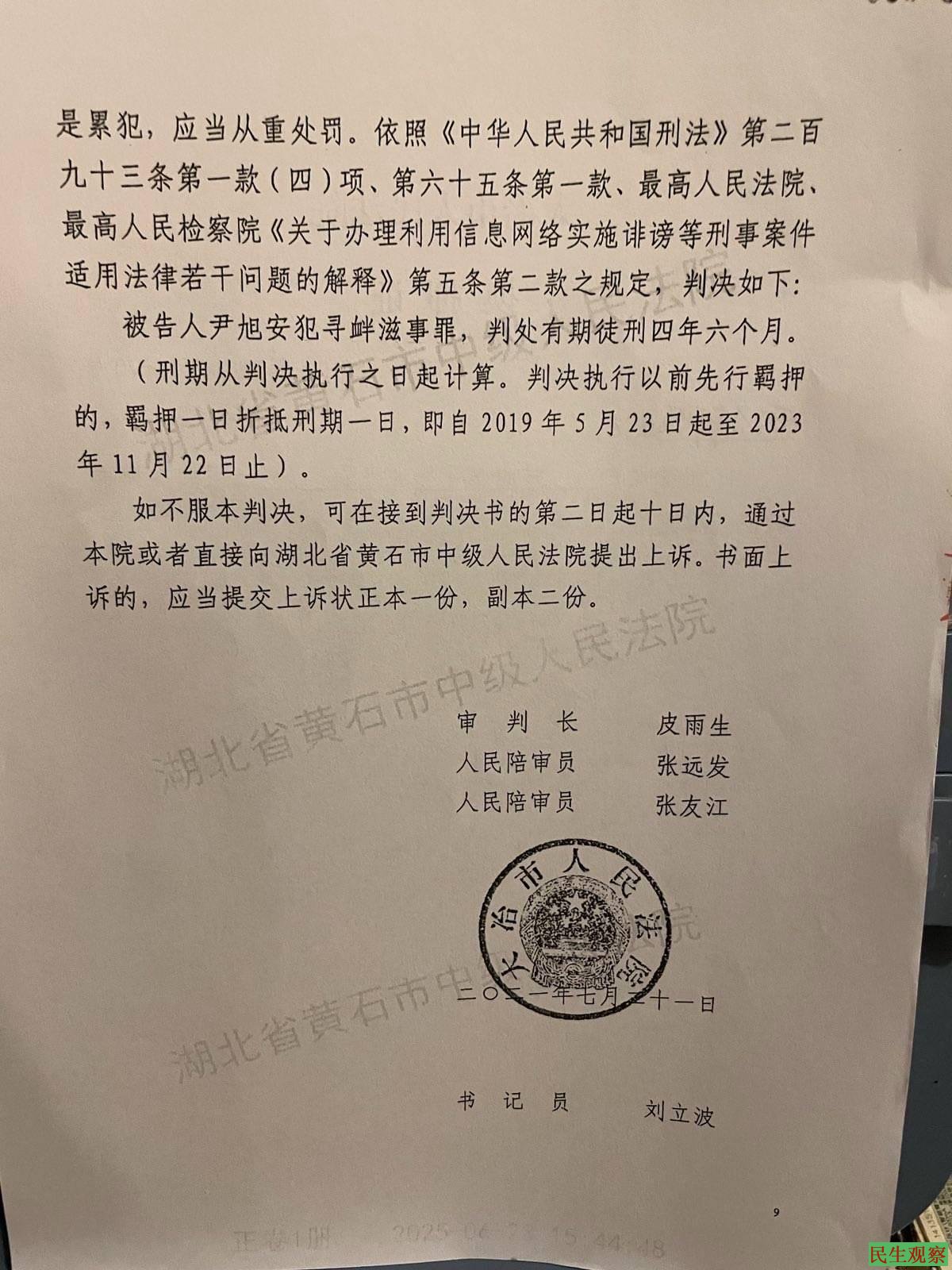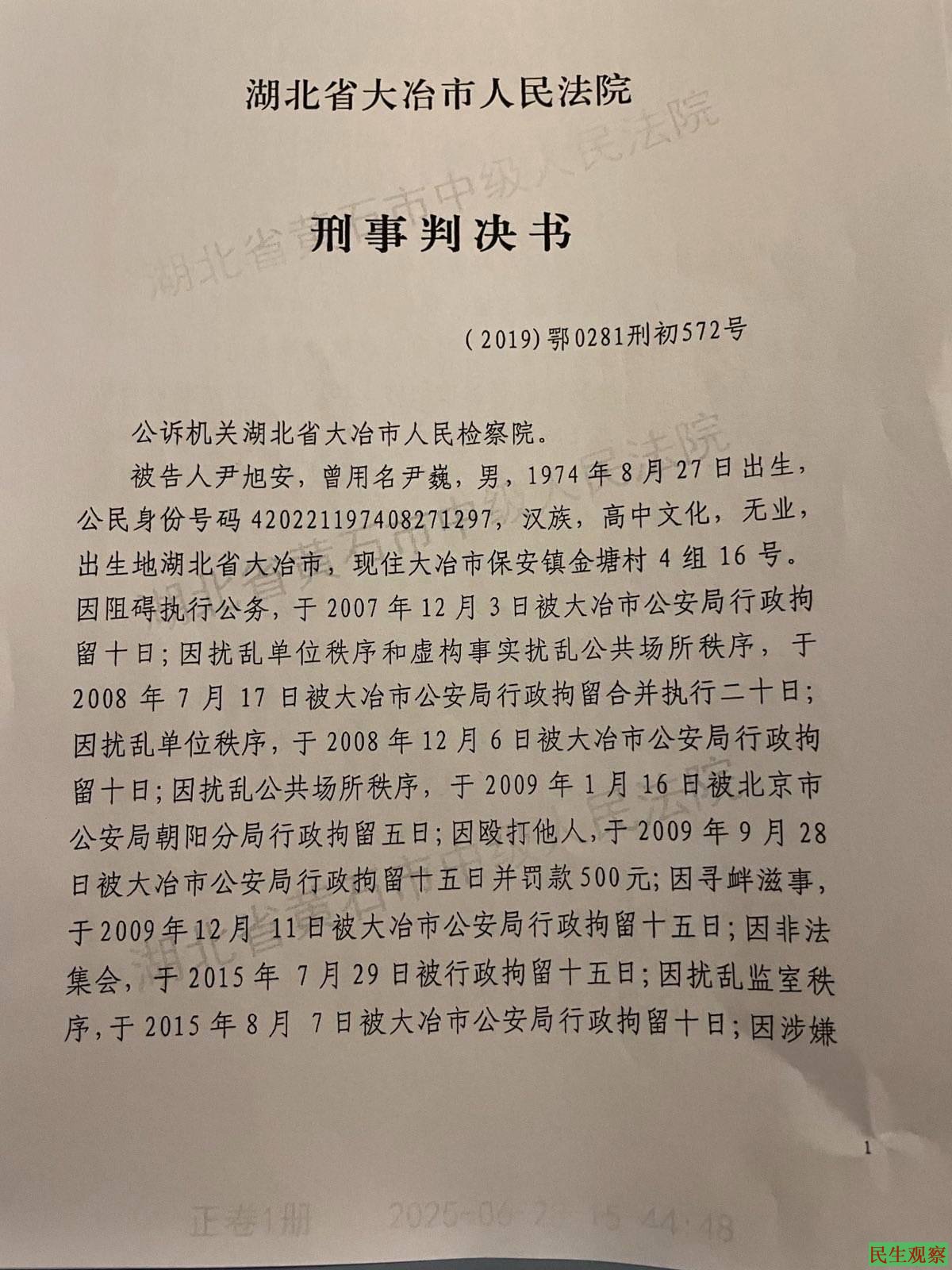 2019年10月,其案被大冶市检察院起诉至地方法院;2020年1月19日,其案被湖北省大冶市法院虽开庭审理,久拖至2021年7月21日终被该法院以“寻衅滋事罪”判处有期徒刑4年6个月,刑期至2023年11月22日;据悉,其在狱中身体状况极差,已被抢救数次。尹旭安案二审2022年1月28日宣判维持原判四年半。此前在黄州监狱服刑。