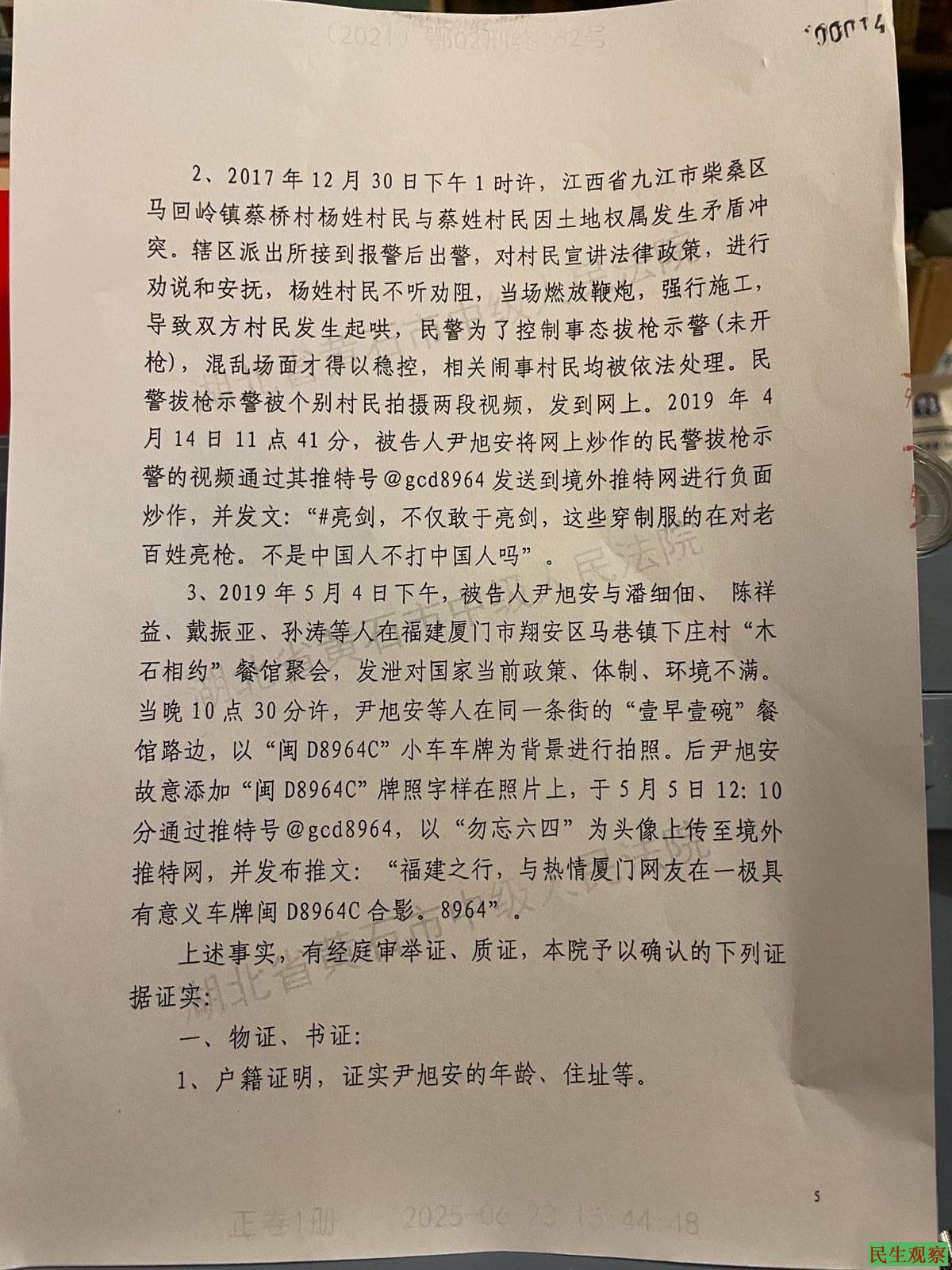 2019年5月23日,尹旭安因大冶市保安镇政法委书记袁启发,及金塘村党支记兼村长尹青松等人,在金塘村尹四房湾村民都没同意的情况下,不仅强行量了集体所有的、赖以生存的土地,并把挖掘机开到现场实施强征的不法行为而信访维权,然后就遭到一次次的打击报复,又被以涉嫌“寻衅滋事罪”刑拘。
