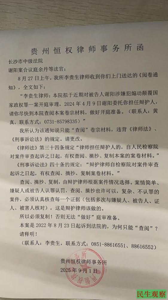 【民生观察2025年9月2日消息】人权律师谢阳被控煽动颠覆国家政权,其辩护律师李贵生近日收到长沙市中级人民法院的阅卷通知,显示其阅卷权遭限。贵州恒权律师事务所认为长沙市中级人民法院在2025年8月27日向该所李贵生律师所送达的《阅卷通知书》只表示“查阅”卷宗材料,违背了《律师法》、《刑事诉讼法》关于辩护律师有权“查阅、摘抄、复制案卷材料”的规定。
