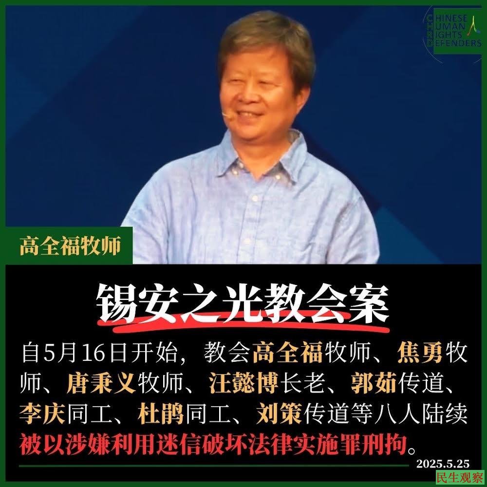 自2025年5月16日起,高全福牧师等十位教牧同工以及庞羽师母陆续被碑林区公安分局国保大队带走调查。
