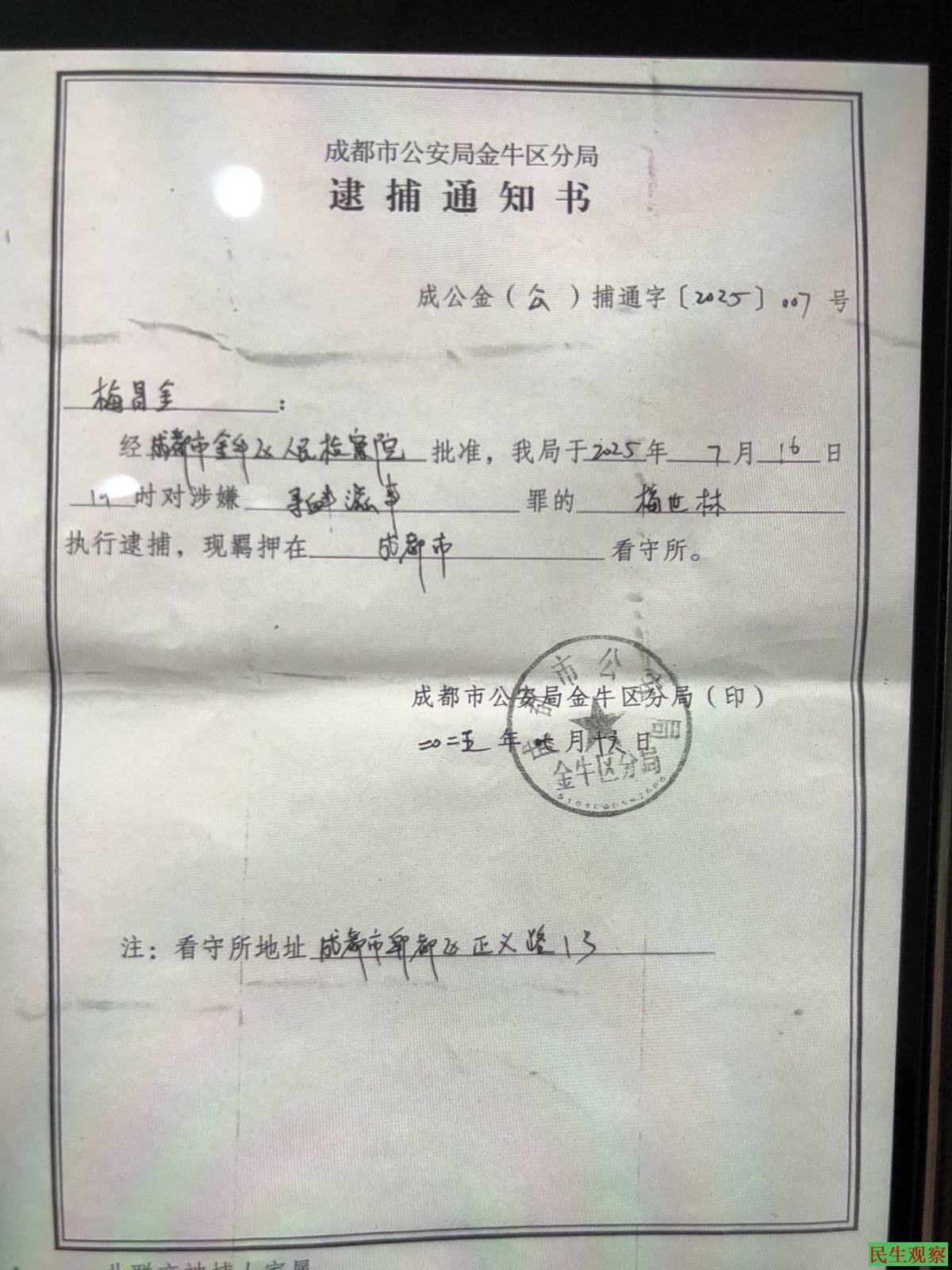 2025年4月15日凌晨,在成都茶店子客运站天桥挂条幅表达政治诉求的四川省乐山市沐川县青年梅世林,于2025年4月16日被刑事拘留,7月16日被逮捕,(期间可能被指定居所监视居住一段时间),罪名为寻衅滋事,关押在成都市看守所。