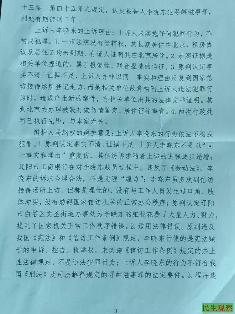 【民生观察2025年10月27日消息】辽宁省辽阳市白塔区维权人士李晓东一审被以寻衅滋事罪判刑二年,其不服判决递交上诉申请。近日案件二审宣判:驳回上诉,维持原判。