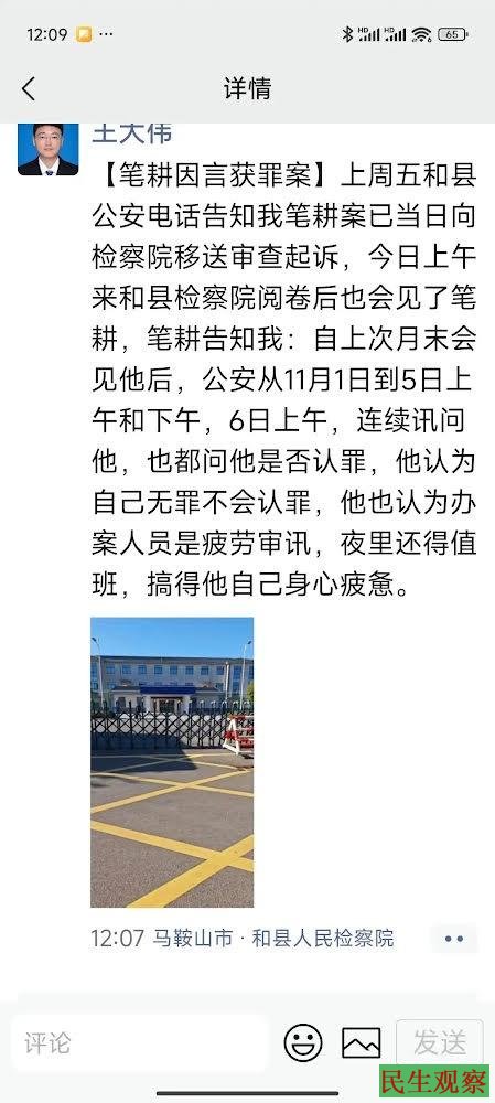 近日据王大伟律师披露,笔耕因言获罪案,上周五和县公安电话告知,笔耕案已于当日向检察院移送审查起诉。