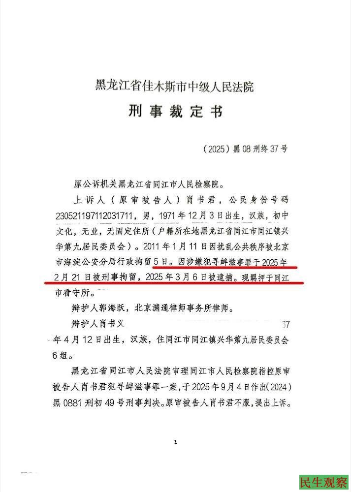 11月19日,佳木斯中级法院二审维持原判,判处肖书君有期徒刑三年六个月,刑期自2025年2月21日至2028年8月20日。