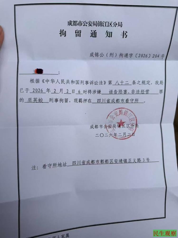 通知书显示,锦江区分局依据《中华人民共和国刑事诉讼法》第八十二条规定,已于2026年2月2日6时,以涉嫌诬告陷害罪、非法经营罪,对媒体人巫英蛟依法刑事拘留。现羁押于四川省成都市看守所。