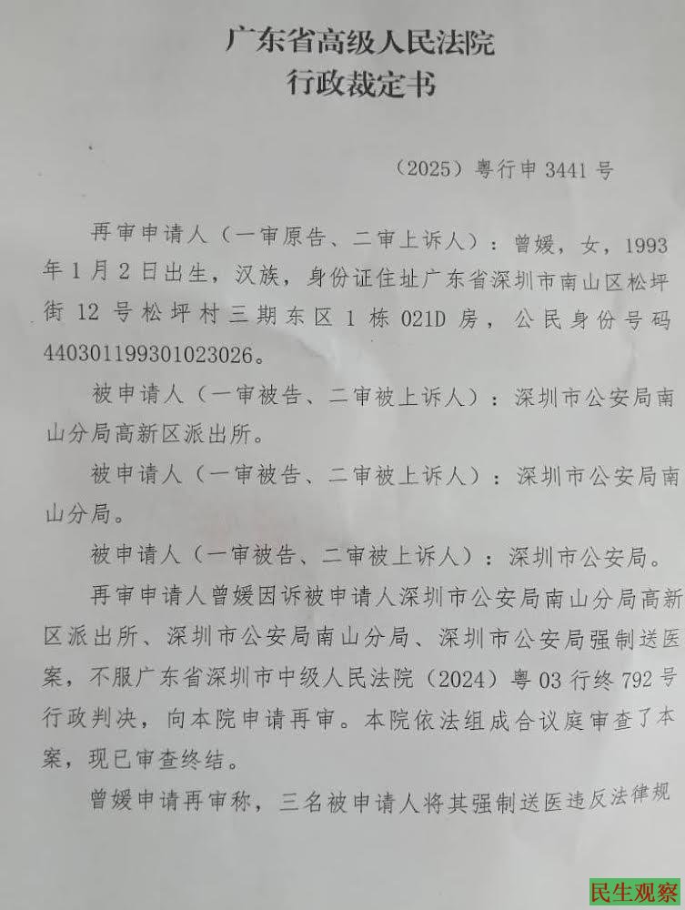 【民生观察2026年4月10日消息】广东省深圳市南山区律师曾媛,因诉深圳市公安局南山分局高新区派出所、深圳市公安局南山分局、深圳市公安局强制送医案,不服广东省深圳市中级人民法院(2024)粤03行终792号行政判决,其向广东省高级人民法院申请再审。近日,曾媛收到广东省高级人民法院的行政裁定书,其再审申请被法院驳回。
