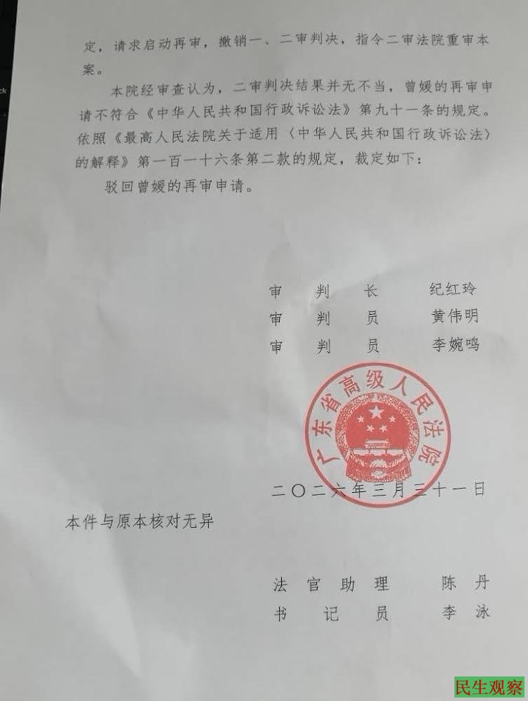 2026年3月31日,曾媛收到了广东省高级人民法院的行政裁定书,其再审申请被法院驳回。