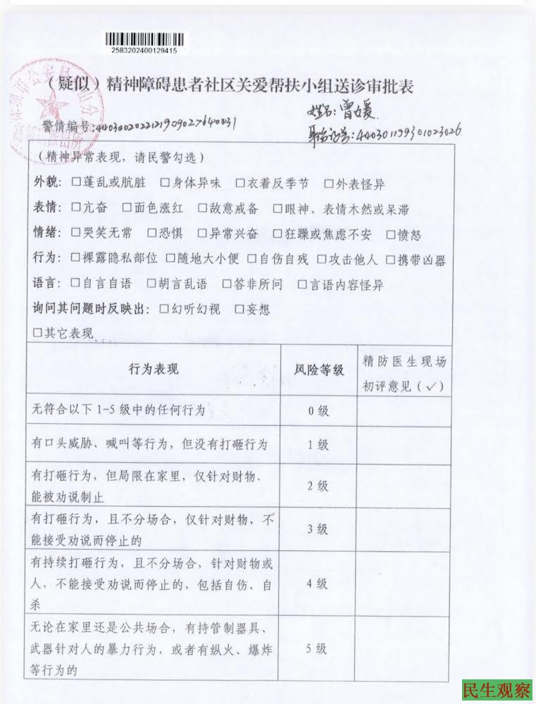 原审法院采纳的送医前的《送诊审批表》显示“疑似精神障碍栏目”为“零勾选”,本案也没有社区精防医生亲自检查再审曾媛的照片,再审曾媛根本没见过社区精防医生。