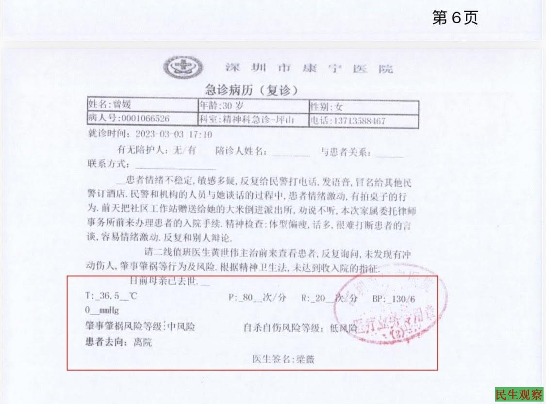 曾媛认为,《精神卫生法》要求强制送医需要符合“疑似精神障碍”和“伤人、伤己风险”的要件,本案出现了【新证据】,即《卫生监督医学专家专业意见书》,专家意见是“案涉病历指向的病史缺乏证据支持”,本案缺少【故意伤害罪】或【自杀】的预备行为的证据,缺少受害人姓名。