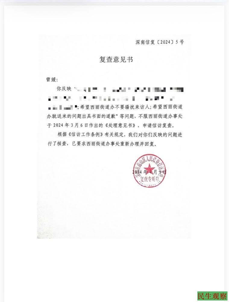 原审法院遗漏深南信复(2024)5号《复查意见书》,属于认定事实错误,南山区信访局的证据与原审法院采纳的松坪山社区工作站出具的《情况说明》存在冲突,南山区信访局的证据表明本案的“送大米行为”是社区未经本人同意的行为,构成不当打扰。