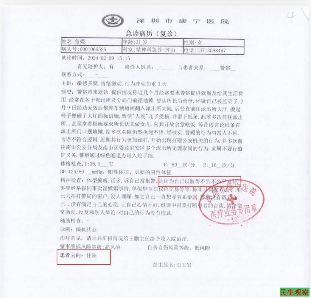 曾媛因被深圳市公安局南山分局高新区派出所、深圳市公安局南山分局、深圳市公安局,联合多次强制送往深圳市康宁医院(深圳市精神卫生研究所、深圳市精神卫生中心)进行住院治疗,出院后曾媛将上述三家公安机关及负责人起诉至深圳中院,深圳市中级人民法院(2024)粤03行终792号作出行政判决,曾媛不服遂向广东省高级人民法院提出再审申请。