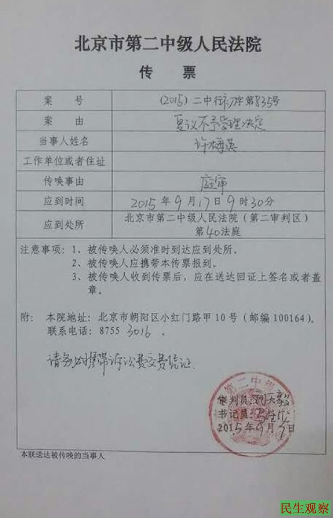 然而在2015年9月17日开庭之前,从9月12日开始,沈阳公安就分别以不同的方式限制五位原告的人身自由,并动用大量的警力在北京和沈阳围追堵截,阻止原告及代理人到庭诉讼,阻止旁听人员参加庭审。原告许梅英、王振华被限制自由无法进京;原告杨兆芳、林淑军、姚立新进京诉讼,被绑架离京;诉讼代理人林明洁、辛颖等人被强行带回沈阳。因此,本应该在2015年9月17日上午9点30分开庭审理,却因为五名原告全部被抓或「失踪」,导致法院被迫取消了当天的庭审。此外,五位访民的诉讼代理人林明杰还在18日被沈阳警方刑事传唤,甚至受到刑拘的威胁。