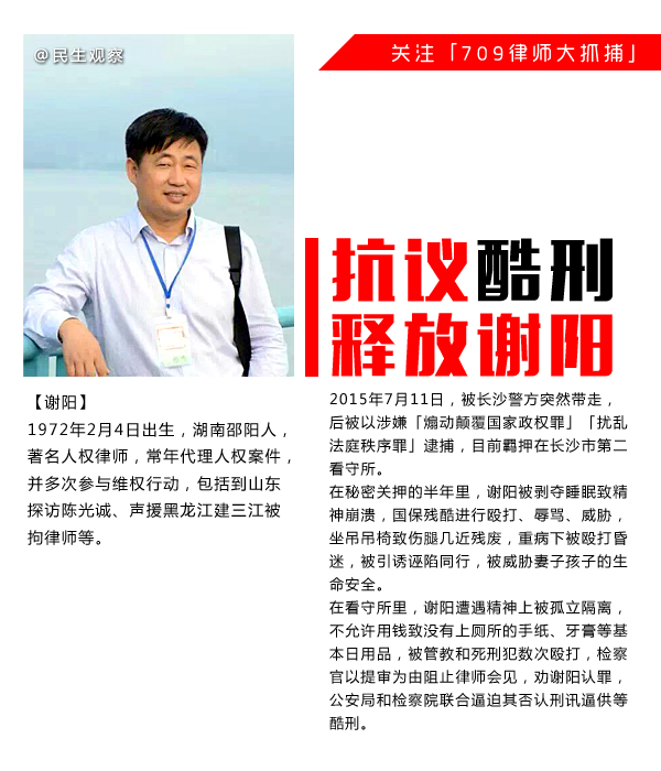 停止迫害 民生观察呼吁立即释放谢阳律师 |