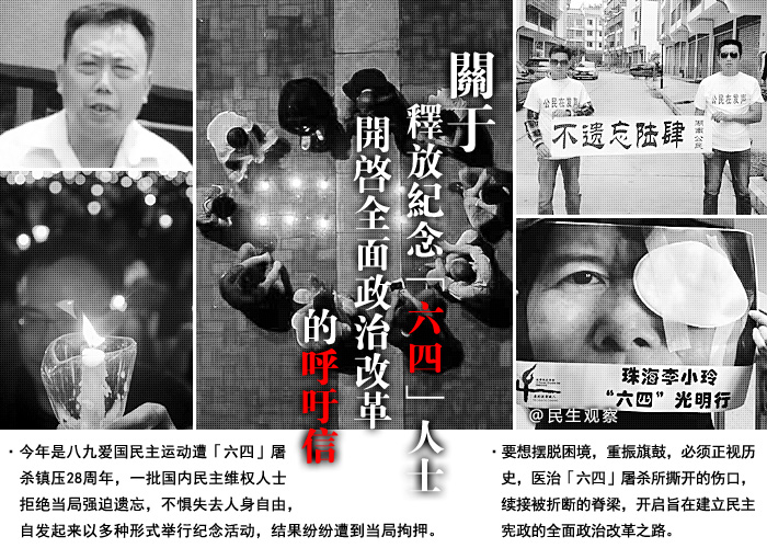 今年是八九爱国民主运动遭“六四”屠杀镇压28周年,一批国内民主维权人士拒绝当局强迫遗忘,不惧失去人身自由,继承八九运动“反腐败、要民主、争人权”的精神,自发起来以多种形式举行纪念活动,结果纷纷遭到当局拘押。民生观察对此表示强烈抗议,严正要求当局立刻释放所有因纪念“六四”而被羁押的人士,正视历史,为中国和平转入人类主流文明而开启全面政治改革。