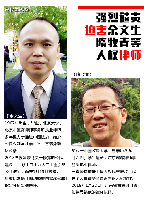 民生观察谴责迫害余文生、隋牧青等人权律师 |
