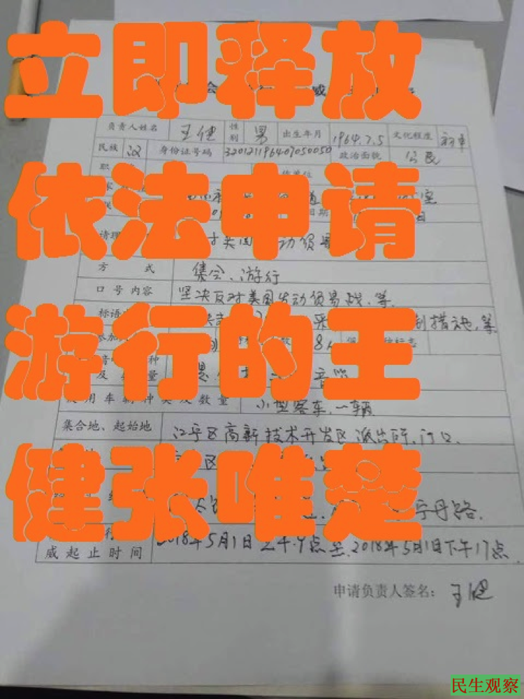 ——依法申请游行无罪,立即释放王健、张唯楚