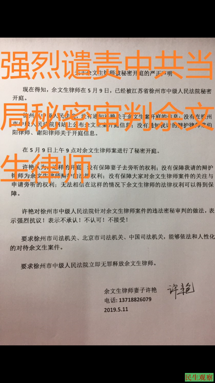 民生观察完全赞同并强烈支持许艳女士的声明!坚决要求中共司法当局无罪释放余文生律师!
