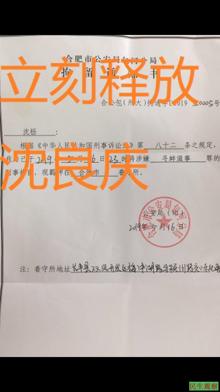 5月23日,维权网披露,已经失联多日的安徽著名异议人士沈良庆被证实于5月16日遭合肥市公安局以涉嫌“寻衅滋事”罪刑事拘留。现在被羁押在合肥看守所。