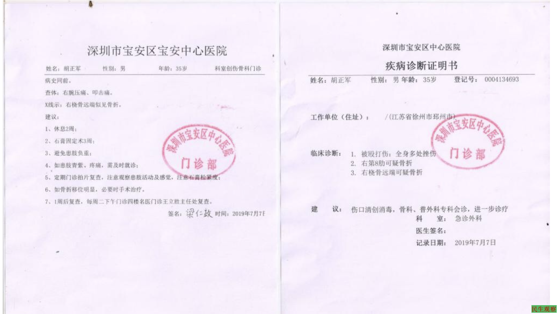 胡正军前往医院诊断为“被殴打伤、全身多发伤、两处骨折、手腕部正中神经损害”,又到精神科医院(深圳市康宁医院)检查发现“创伤后应激障碍、双向性情感障碍”。