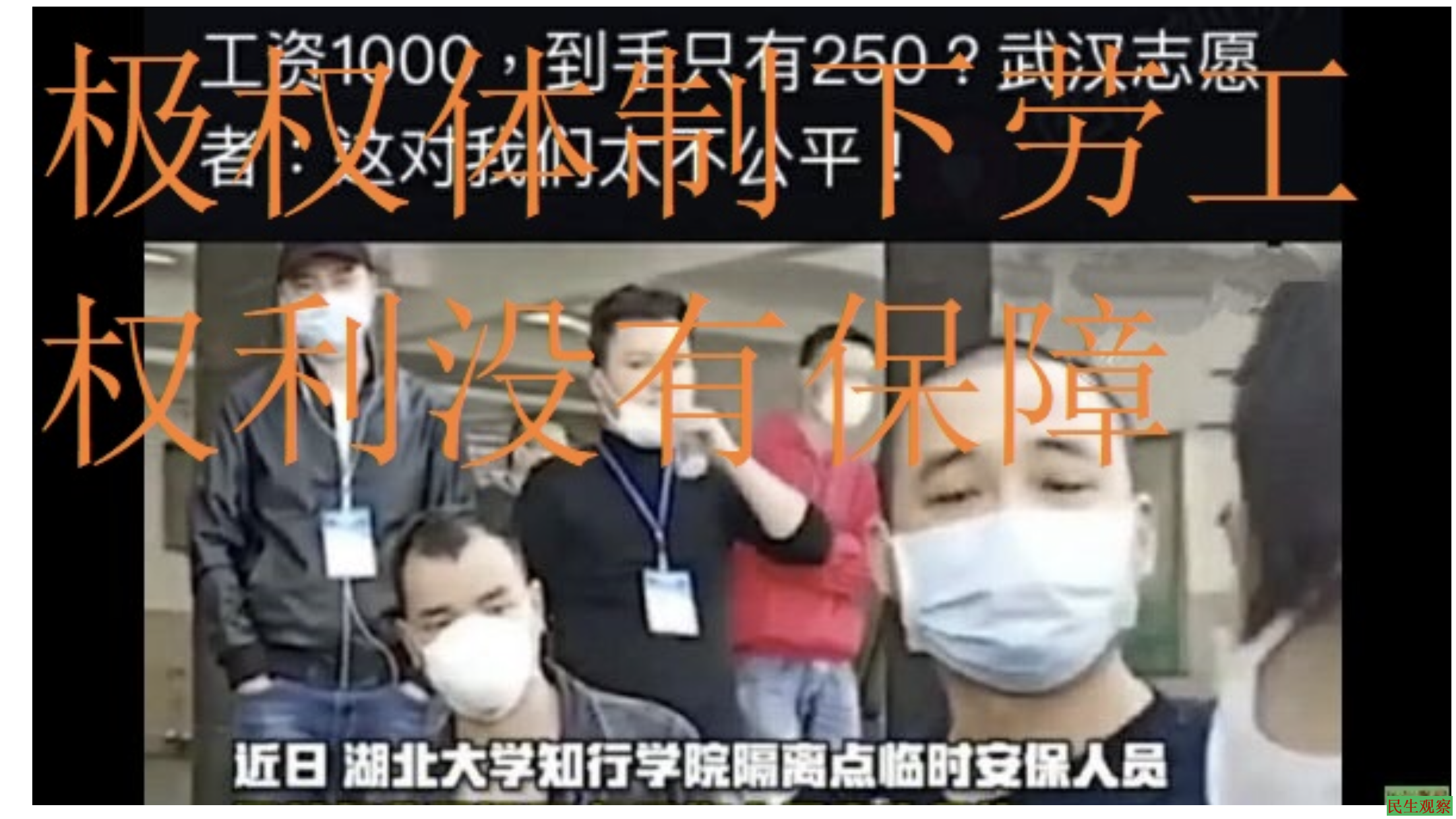 据民生观察报道,3月20日上午,湖北武汉十余名保安人员来到湖北大学防疫隔离点,集体抗议防疫补助费遭领导侵吞。