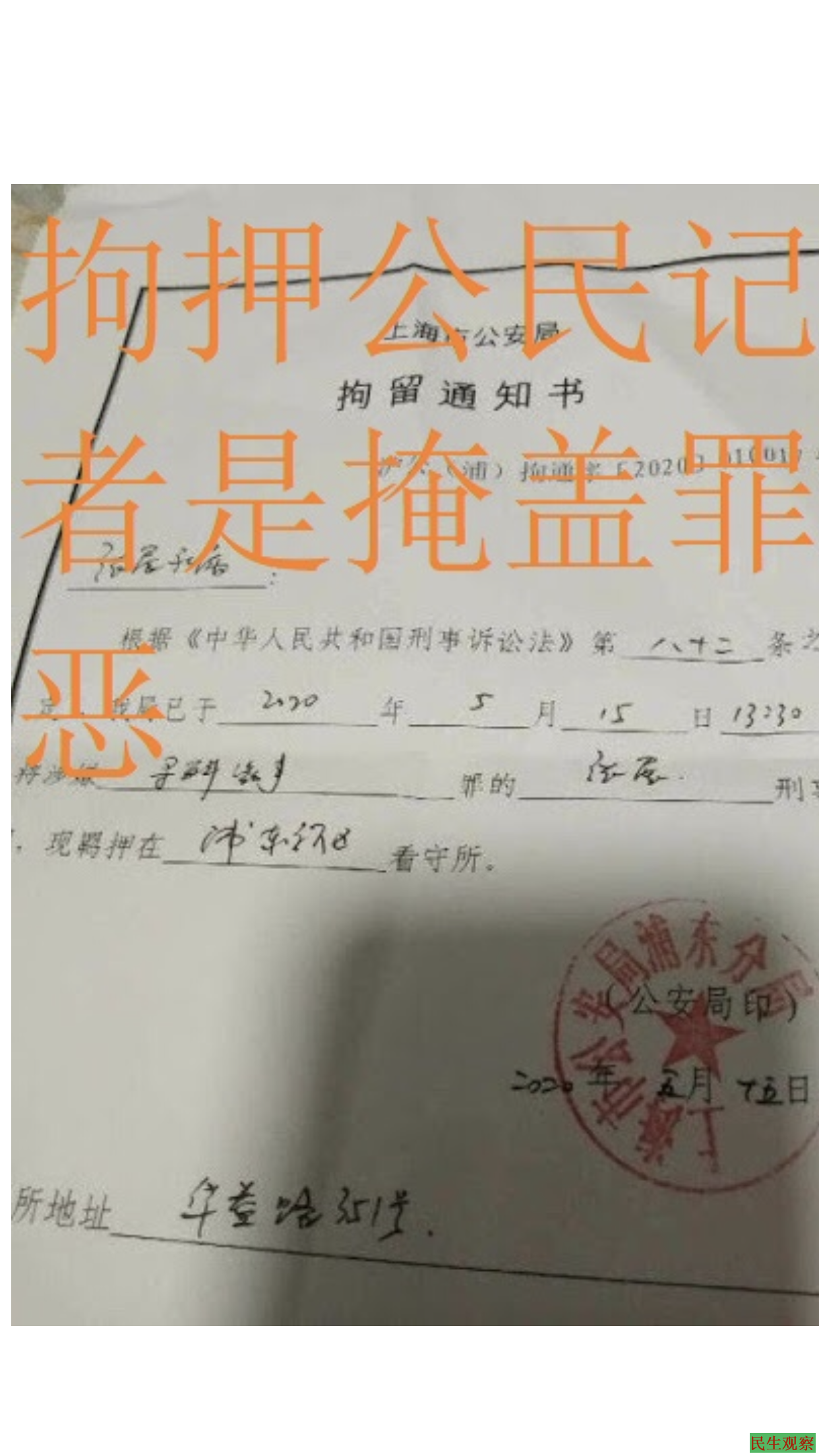 除了直播外,张展亦曾撰文批评疫情管控不应以逼害人权的方式施行,称“政府以治疗为名义,将个体与外界社会的信息进行隔绝。以稳定的名义,把疾病、死亡的人数进行掩盖。以正能量的名义,对新闻进行控制……要治理瘟疫,有太多的软性环境可以改善,有太多的细节都可以做。但我们偏偏不。我们就是强制、暴力地命令,单方面剥夺民众的人身、财产等等权利。”这些质疑与批评早就让朋友们为张展捏把汗,因为在中国,批评政府就意味着将陷牢狱。果然,到5月17日,外界终于获悉张展已于15日被上海警方以涉嫌“寻衅滋事”罪实施刑事拘留,现羁押在上海市浦东新区看守所。