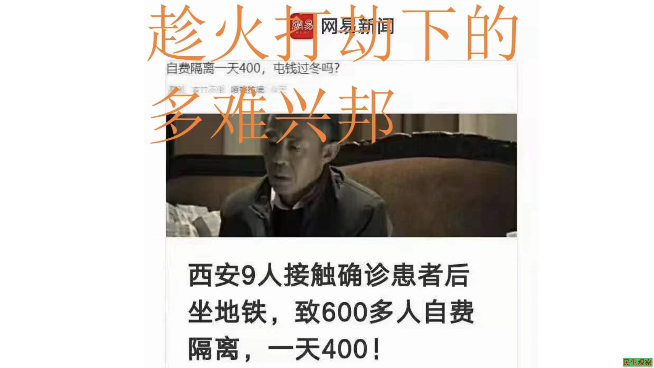 据民生观察报道:1月5日陕西西安9人赴河北参加婚礼,后被认定为与新冠病毒的密接者,因此与密接者同乘一地铁车厢的乘客已被管控隔离。截至1月7日,西安涉及到的隔离管控人员接近1000人,但有被隔离市民爆料隔离费用一天400多元需要完全自理。