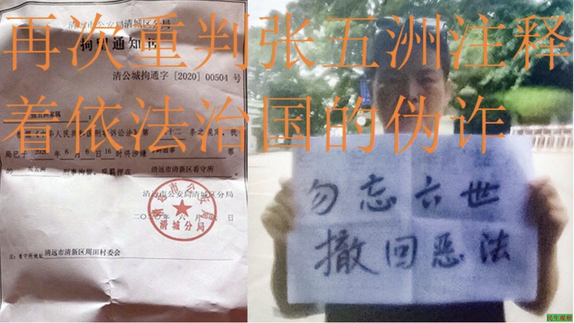 民生观察在此强烈谴责中共广东执法当局一再违法侵权迫害报复张五洲,要求广东执法当局立刻无罪释放张五洲并追究相关施害者的法律责任!同时敦促中共当局切实兑现依法治国承诺,停止迫害人权捍卫者。