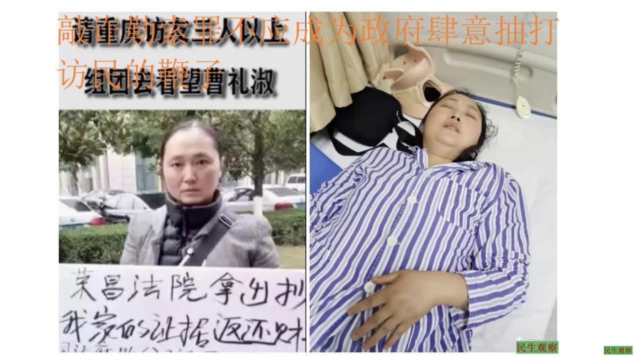 曹礼淑是重庆市荣昌区昌州街道黄金坡社区二组村民。2019年5月19日,在没有签订任何协议也没有得到任何补偿安置的情况下,荣昌区政府及职能部门组织几百人,拉起警戒线不准过路人和产权人进入,将曹礼淑姐弟几户人家的合法房屋强行拆除,室内外所有财物均被掩埋。曹礼淑为此多方投诉维权,但问题始终得不到解决。2021年“七一”前夕,曹礼淑前往北京打工并顺路到郑州探望亲戚时,被重庆荣昌区信访办和公安局治安支队等七八个人拦截打瘫,后被带回重庆荣昌的医院,但政府对有关医治与费用不管。曹礼淑在医院救治,积欠医药费,院方将其病房断电,她和家人多次找街道办要求处理,但一直没有结果。曹礼淑要求打伤自己的有关部门赔偿相应医药费用,结果现在被地方政府扣上“敲诈勒索罪”。
