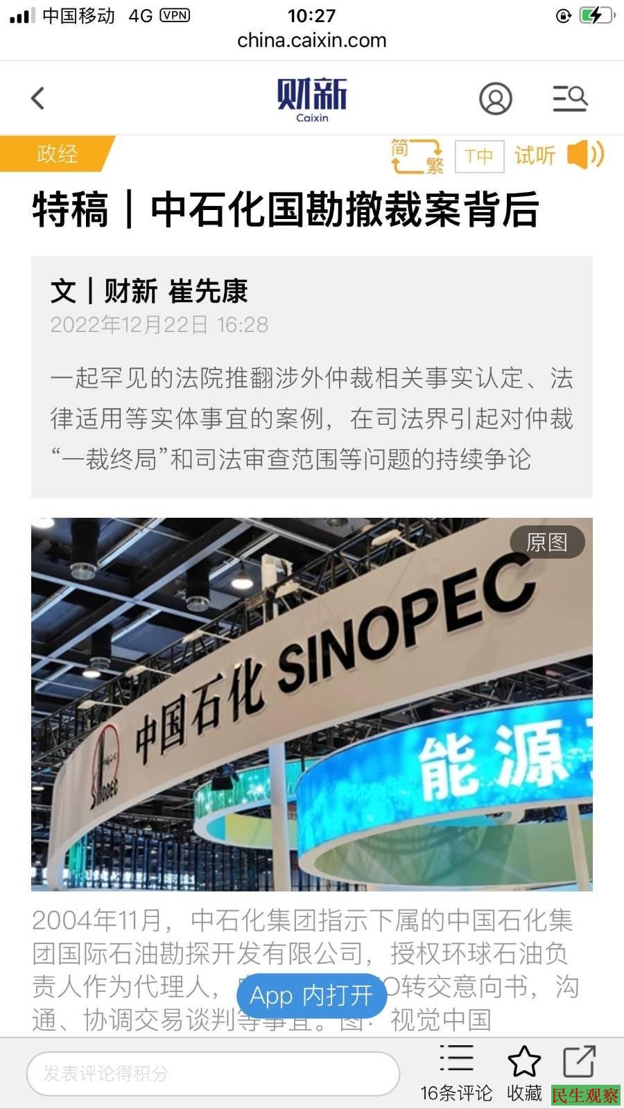 岂料,原本仅由中石化与PK公司独家谈判的收购被半路杀出的另一家中共巨型央企中国石油天然气集团公司(中石油)搅局,最终由中共发改委协调,由中石油和中石化联合收购,事成之后中石油占所收购PK公司股权的60%、中石化占40%,后中石化放弃竞标;2005年8月-2006年7月中石油独自收购了PK公司67%的股权;2007年,又经中共发改委协调,中石油和中石化达成协议,中石油向中石化转让所持PK公司30%的资产,相当于向中石化转让PK公司20.1%的股权,但该部分股权始终未能过户给中石化,UNI-TOP公司屡屡与中石化交涉,索要佣金,中石化均以尚未获得股权为由拒绝支付佣金。2012年8月,在中石油成功收购PK公司七年之后,UNI-TOP公司被迫向中国国际经济贸易仲裁委员会(贸仲委)申请仲裁,同年 12月,贸仲委认为酬金的支付条件尚未成熟,驳回了UNITOP公司的仲裁请求;2015年,UNI-TOP公司以中石化事实上怠于向中石油索要股权之新事实为由,再次向贸仲委提起仲裁,2017年6月30日,贸仲委第二次裁决国勘公司支付2138.01万美元酬金(佣金)等费用。然而,中石化竟以子虚乌有的所谓第二次仲裁违反“一事不再理”原则以及仲裁裁决将导致所谓的国有资产流失等法律之外的高大上的政治理由向中共北京市第四中级法院申请撤销仲裁裁决,而中共北京市四中院居然果真听信、认可中石化的胡言乱语,不惜以中共司法信誉为中石化背书,悍然撤销了仲裁裁决,帮助中石化赖掉了应付的佣金,保住了无耻却又冠冕堂皇的所谓国有资产和国家利益,尽管这笔2138.01万美元佣金根本不够中石化时任老总陈同海等人的几次挥霍!