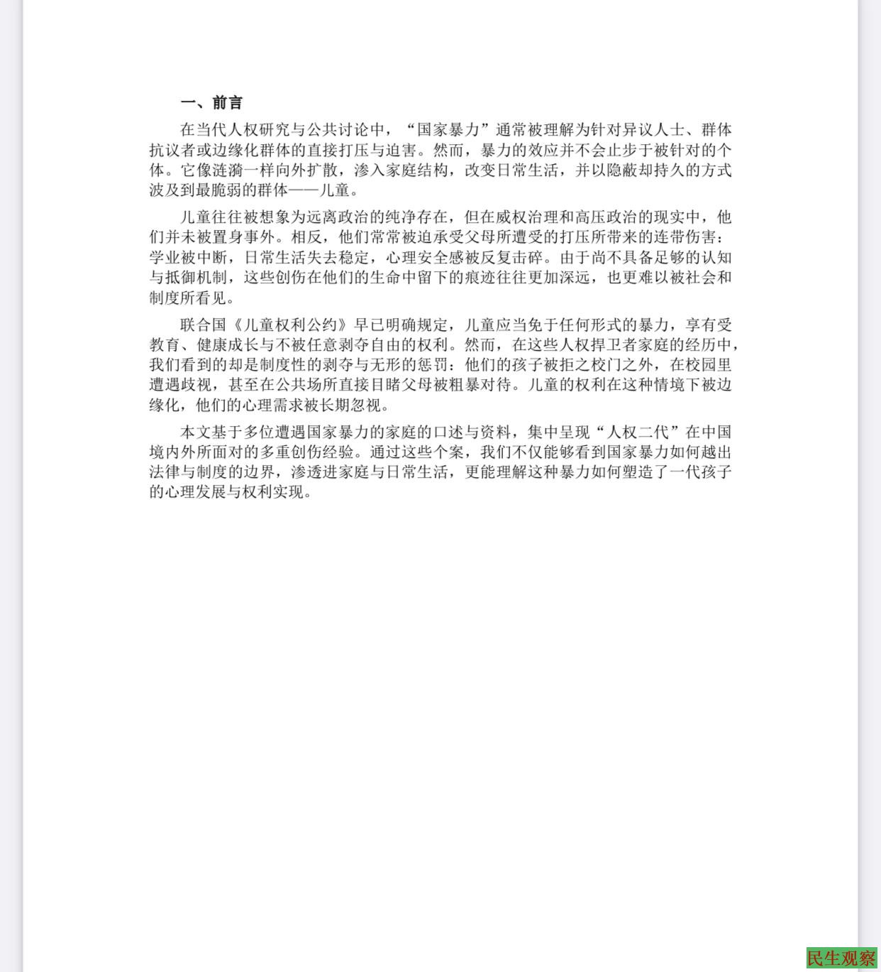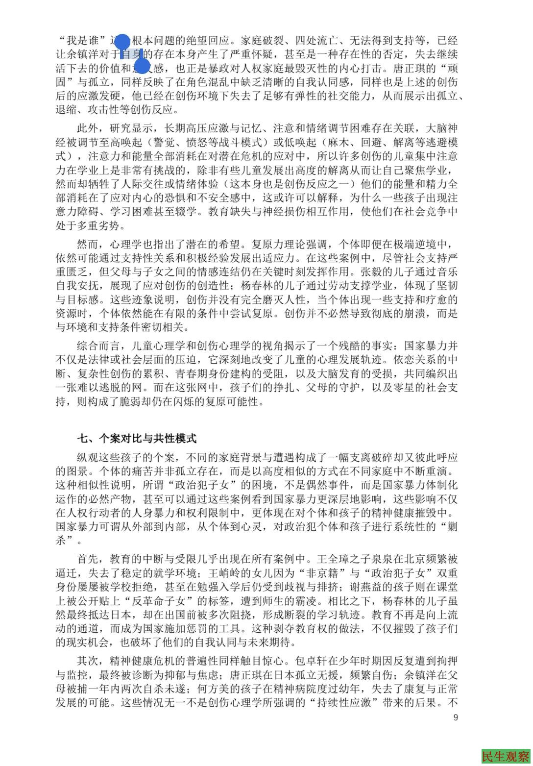 2025年10月9日,世界精神卫生日前夕,中国民间组织“中国人权捍卫者亲友网络”发布了近三万字的专题研究报告——《被连坐的童年:国家暴力下的人权捍卫者子女心理创伤》。这是国内外首次系统性地揭示人权捍卫者家庭子女在国家暴力环境下的处境与心理创伤,报告通过个案访谈与资料梳理,集中呈现了“人权二代”所面对的教育剥夺、社会孤立、心理危机与跨代创伤。