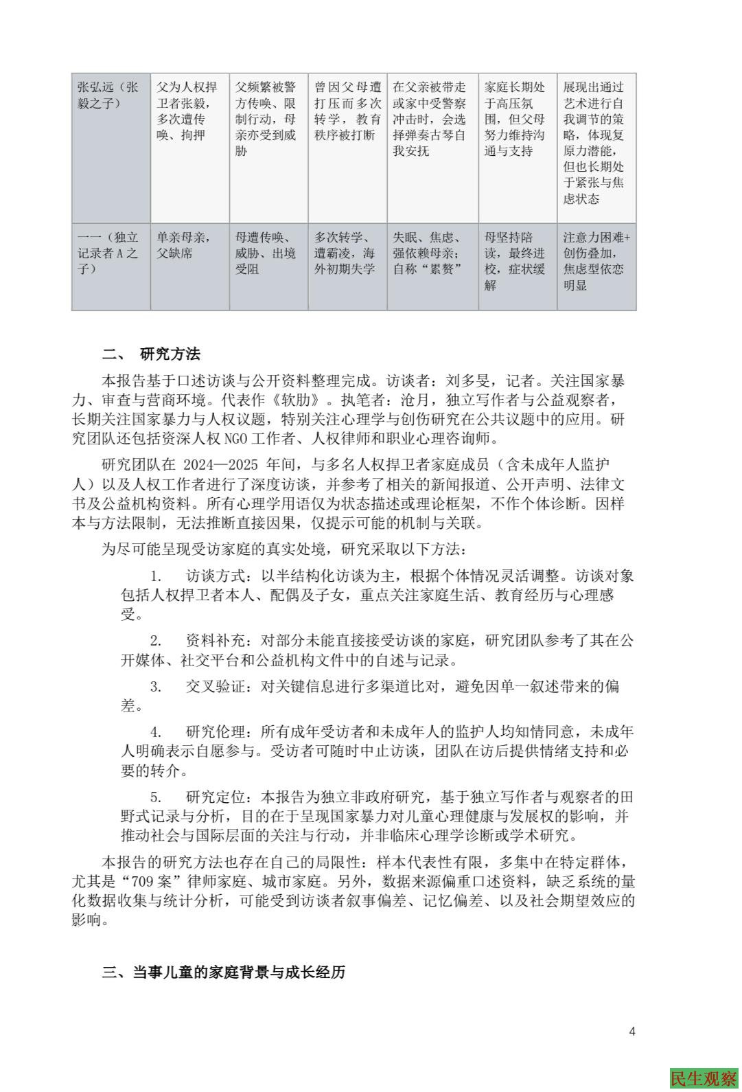据“中国人权捍卫者亲友网络”成员、来自北京的人权律师刘巍女士介绍,本报告由独立记者、职业心理咨询师、人权律师和NGO工作者共同完成。团队在2024—2025年间与多位人权捍卫者家庭成员进行访谈,并参考了公开媒体和法律文书等文献资料。研究并未进行临床诊断,而是基于心理学和创伤学框架进行分析,目的在于揭示国家暴力的代际效应,并推动社会和国际关注。