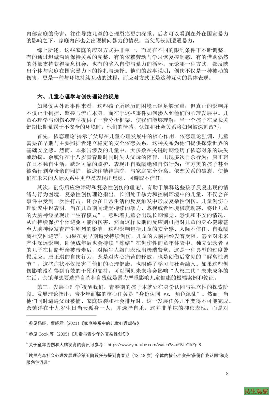 报告最后强调:如果社会和国际社会继续忽视这些孩子,他们所背负的创伤与沉默将一代代延续,成为长期的伤痛。唯有正视、支持和行动,才能为他们打破“被连坐的童年”。