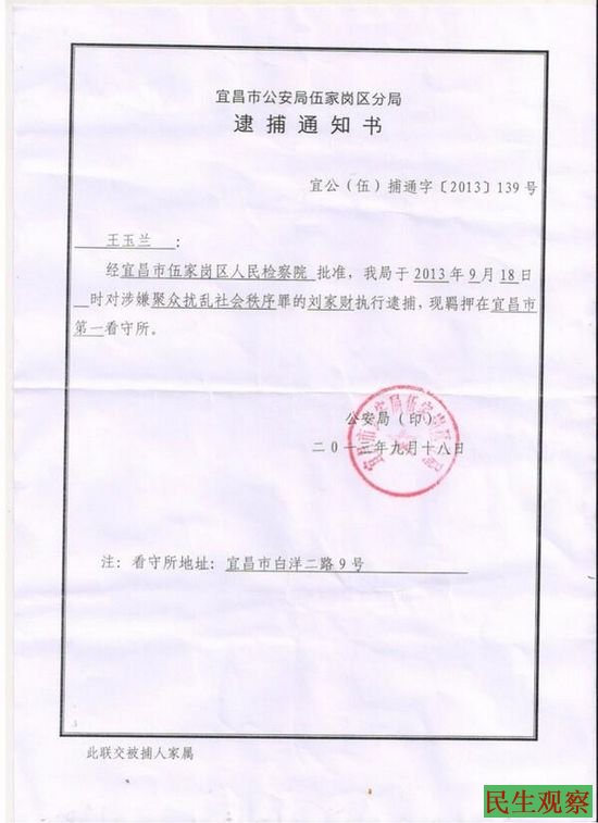 通知书显示,刘家财已被宜昌市伍家岗区检察院批准逮捕,由宜昌市伍家岗区公安分局执行逮捕,现关押在宜昌市第一看过所。不通刘家财的涉嫌罪名已由刑拘时的“煽动颠覆国家政权罪”改为了“扰乱社会秩序罪”。