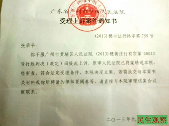 据悉,张荣平从拘留所出来后,对广州市警方对他进行行政拘留的处罚不服,将广州市警方告上了法庭,法院一审的结果张荣平依然不服,就向广东省广州市中级人民法院提起了上诉。昨天,张荣平收到了广东省广州市中级人民法院的《受理上诉案件通知书》和广东省广州市中级人民法院的传票,要求张荣平在2013年10月21日15时30分,到该院第四十四法庭接受该案的审理。张荣平对此说道:“今天,我收到广州市中级法院受理我的行政上诉案件的传票,为推动和见证中国民主与法制建设的进程,欢迎大家到时参加旁听!如果我自己辩护,我就说:‘我藐视独裁政府的法律,随便你们怎么判,我相信历史会给我公正判决。’”