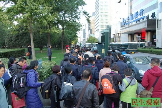 闻听这个消息,正在北京上访的建行、工行、中行、农行四大银行的买断下岗职工纷纷赶到建行总行前希望借此陈情申冤。据到现场的伍立娟向本工作室介绍,云集在建行前的四大银行下岗职工达近千人,但建行门口早已准备了很多警察与警车,包括儿童医院侧面都是很多警察与警车,公交车也有一、二十辆。下岗职工们一到这里,就被警察抓住拉上公交车。到上午十点,目击者就看到公交车已拉走了三、四车下岗职工了。