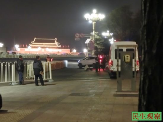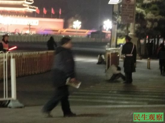 本工作室的在京志愿者获知消息后,连夜赶到了事发现场。在事发现场志愿者看到,在北京市天寒地冻的夜晚,访民刘艳依旧独自一人坐在天安门广场那冰冷的地面上,而她身旁的执勤武警则对坐在身边的受难公民刘艳,却视而不见、无动于衷。