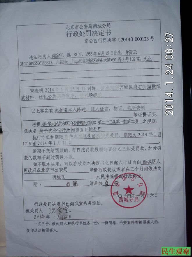 民生观察工作室2014-1-24消息:据上海维权人士朱金娣给本工作室发来消息,上海拆迁户、世博难民沈金宝今天下午在国家信访局上访时被北京警察抓走,现下落不明。据悉,1月15日,沈金宝因在府右街撕状纸刚被北京警方拘留五天出来。